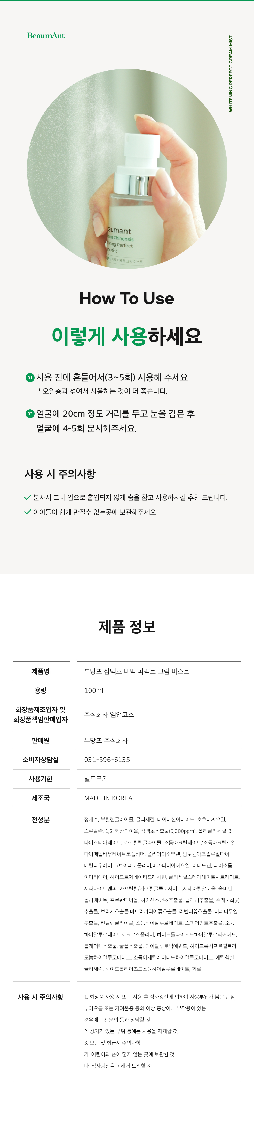 BeaumAnt 뷰망뜨 삼백초 퍼펙트 미백 크림 미스트 100ml